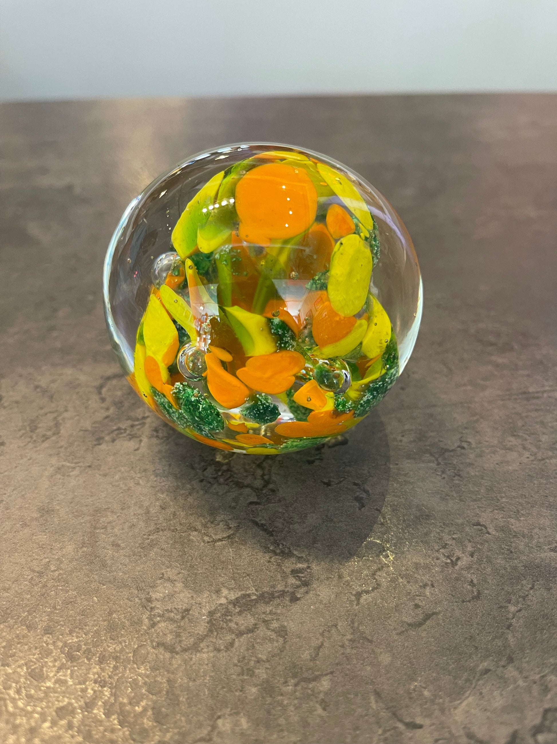Green, yellow, orange art glass paper weight. Approx 3” round