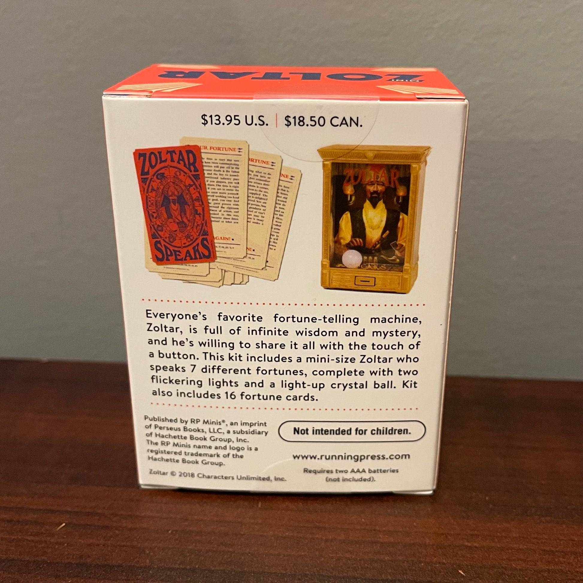 Inspired by everyone's favorite all-knowing animatronic fortune teller, this one-of-a-kind, mini-size talking Zoltar brings his fortune-telling wisdom to your home or office. ·Specifications: 4" replica of the iconic animatronic fortune-teller, Zoltar, printed on clear plastic and housed within his booth ·With Sound and Light: At the press of a button, Zoltar speaks a handful of wise fortunes while the lights on his booth flicker and his crystal ball lights up ·Fortune Cards Included: 16 fortune-telling cards to lend words of wisdom and advice ·Portable: Small size allows for fun anytime, anywhere ·Officially Licensed: An authentic Zoltar collectible