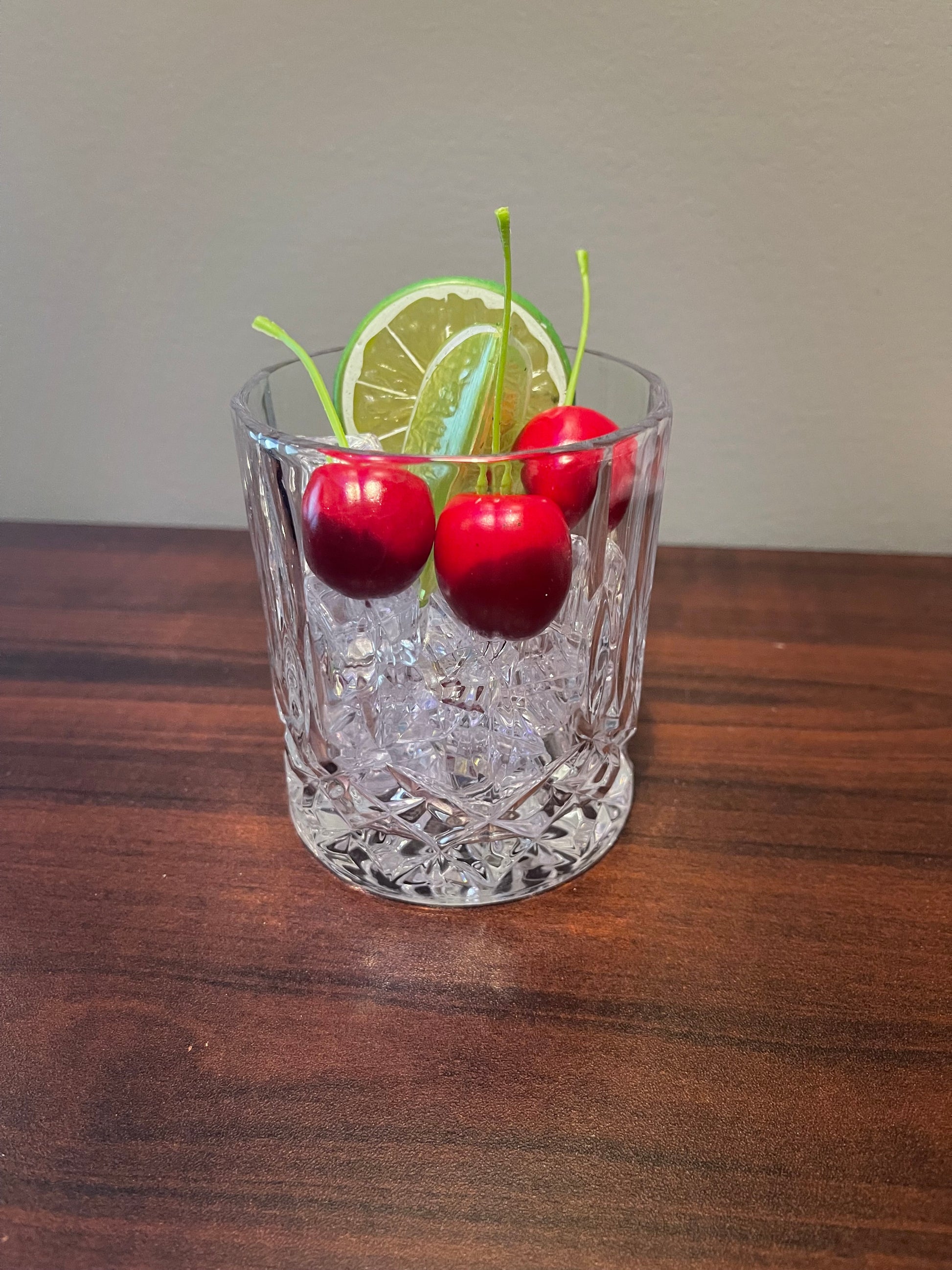 1 lime slice, 1 lime wedge, 3 cherries, 30 pieces of ice in a rocks glass.