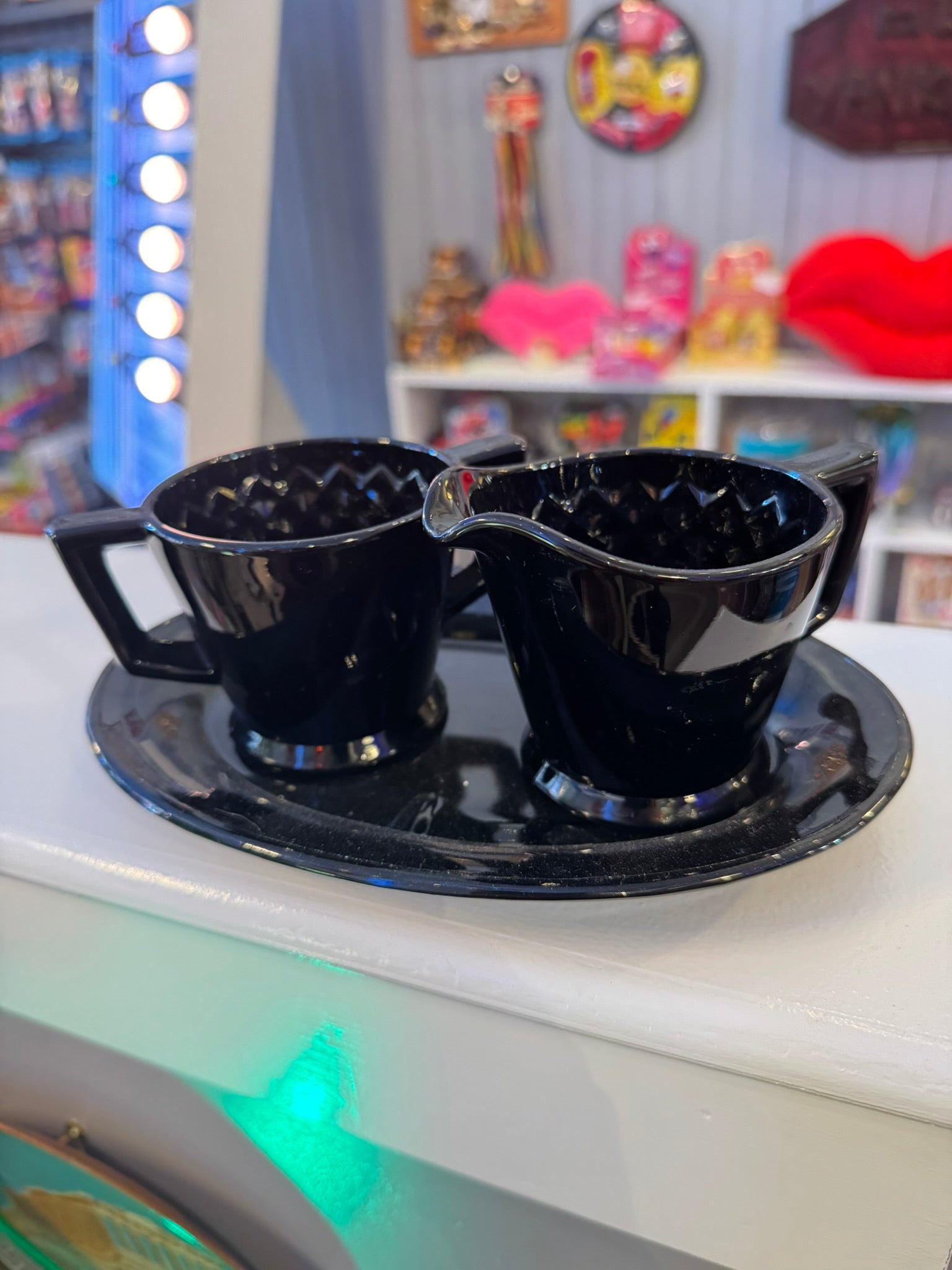 Set of 3 vintage black glass creamer, sugar and dish tray. Perfect condition.