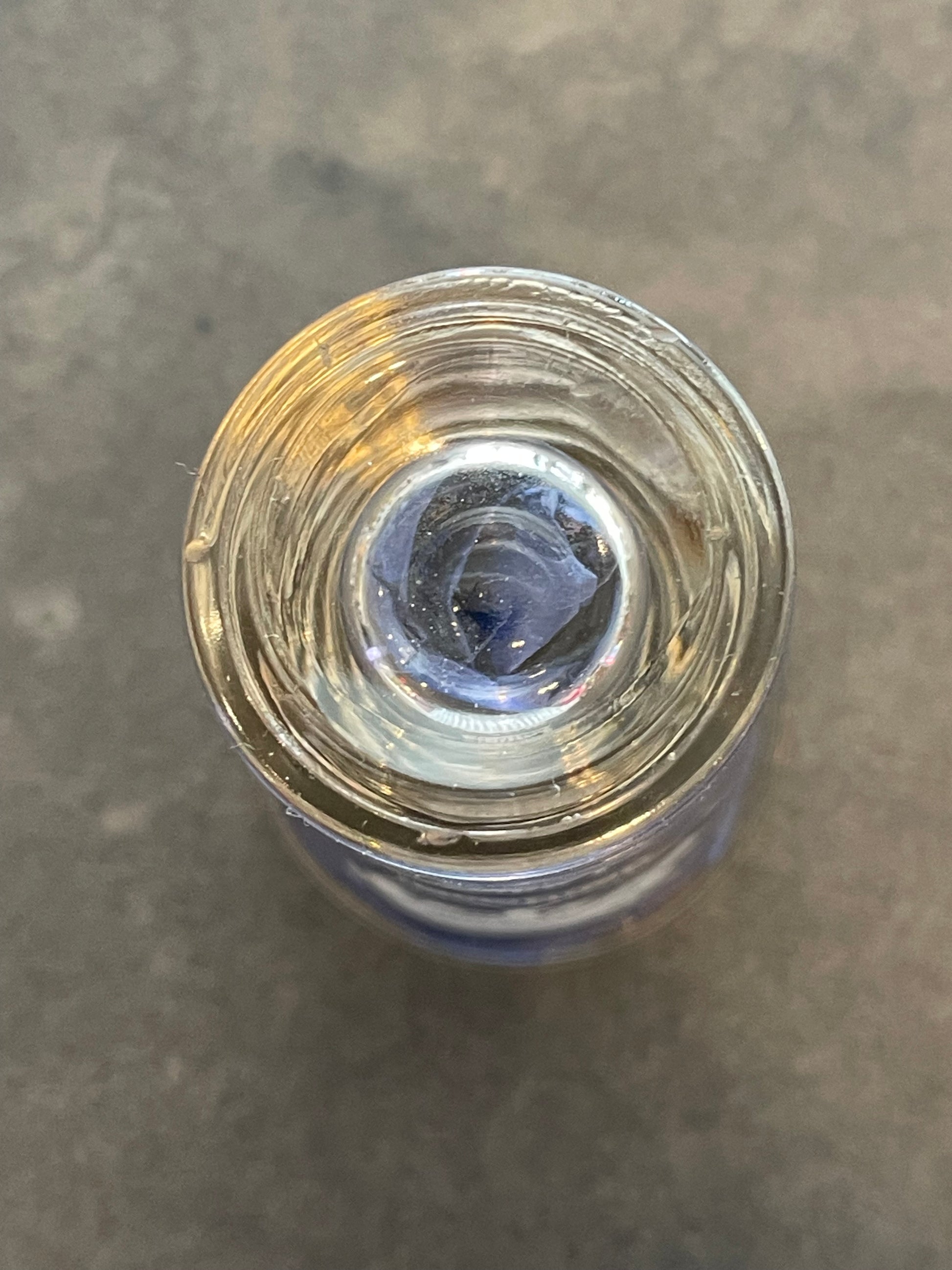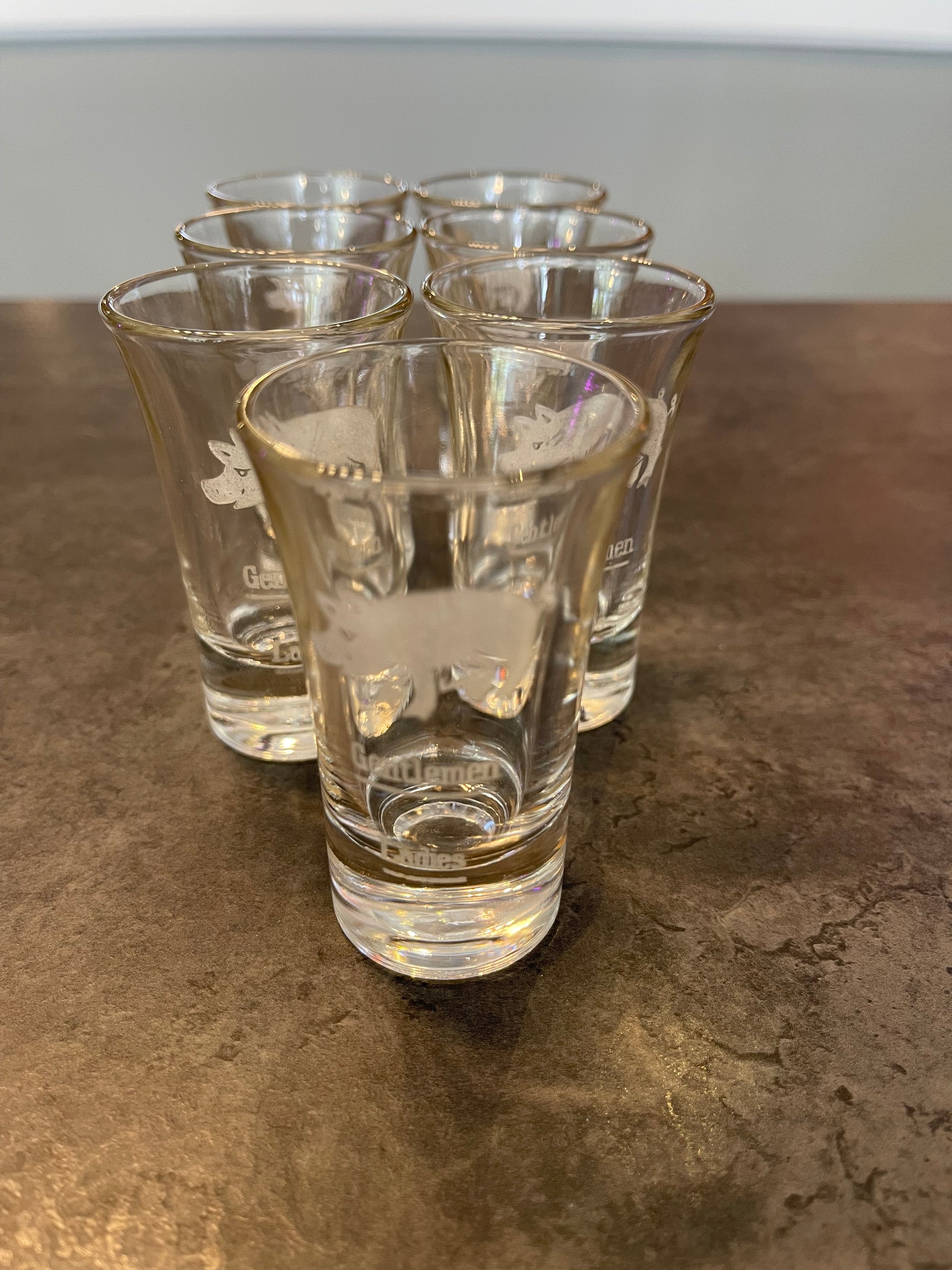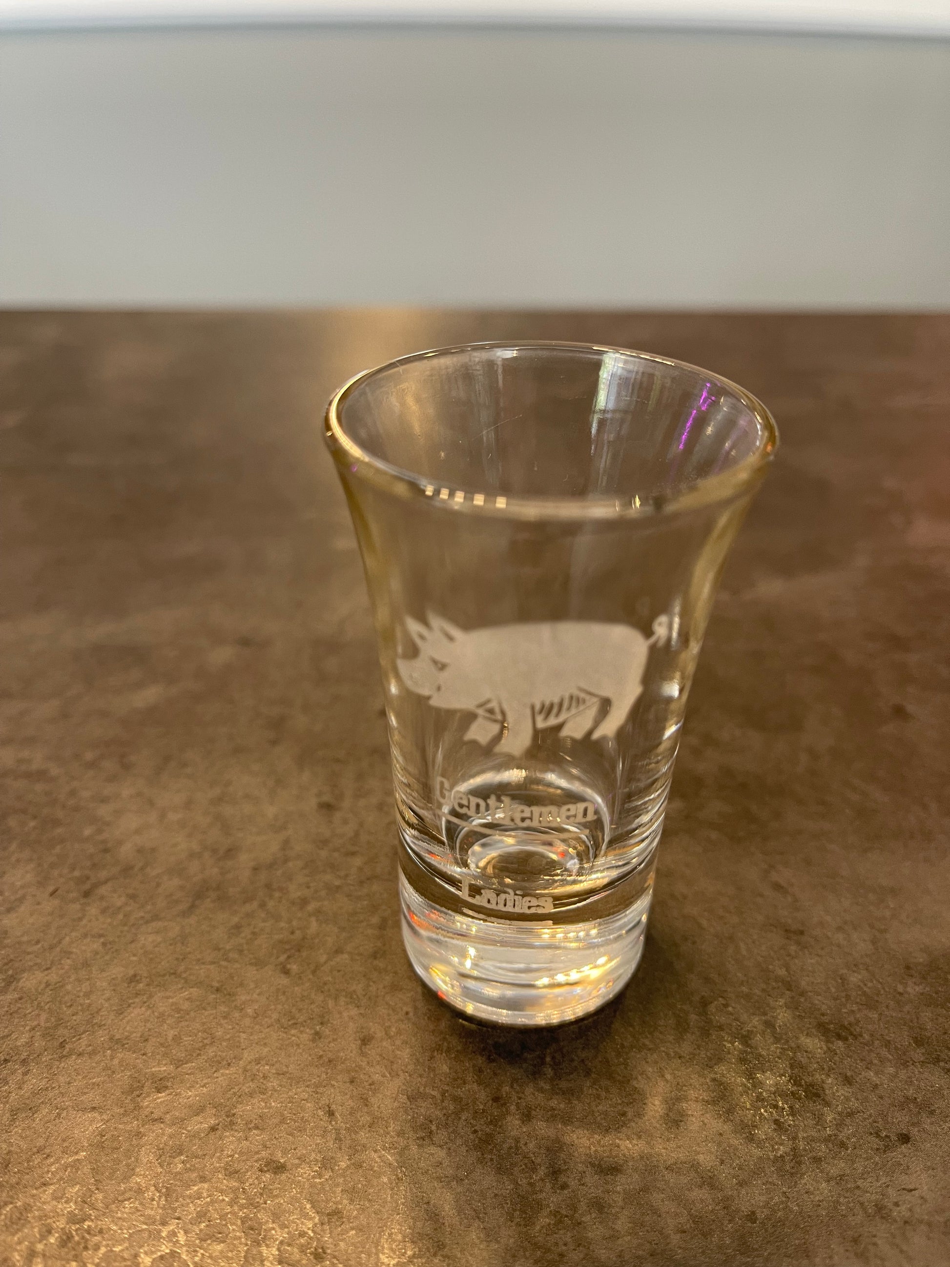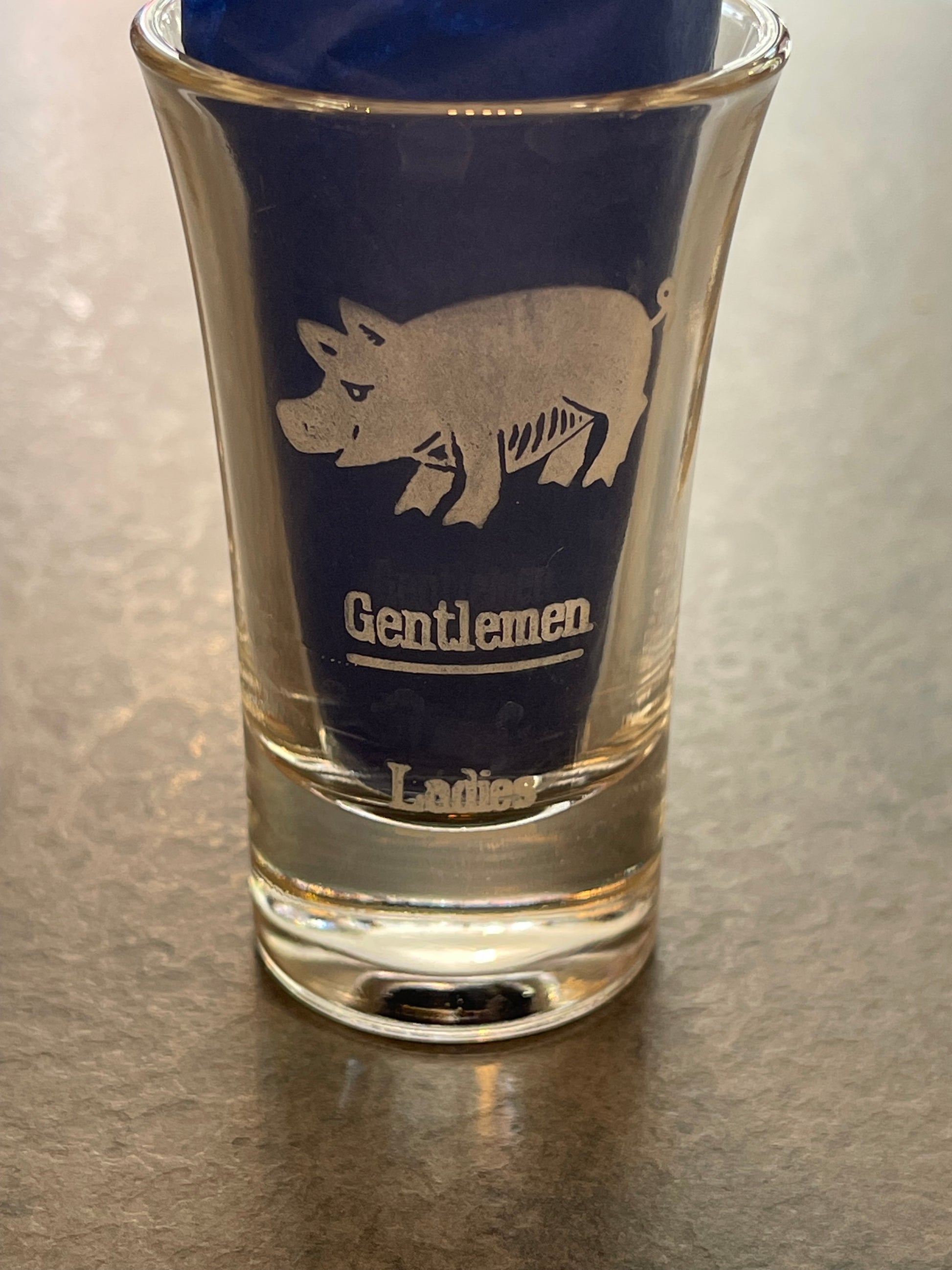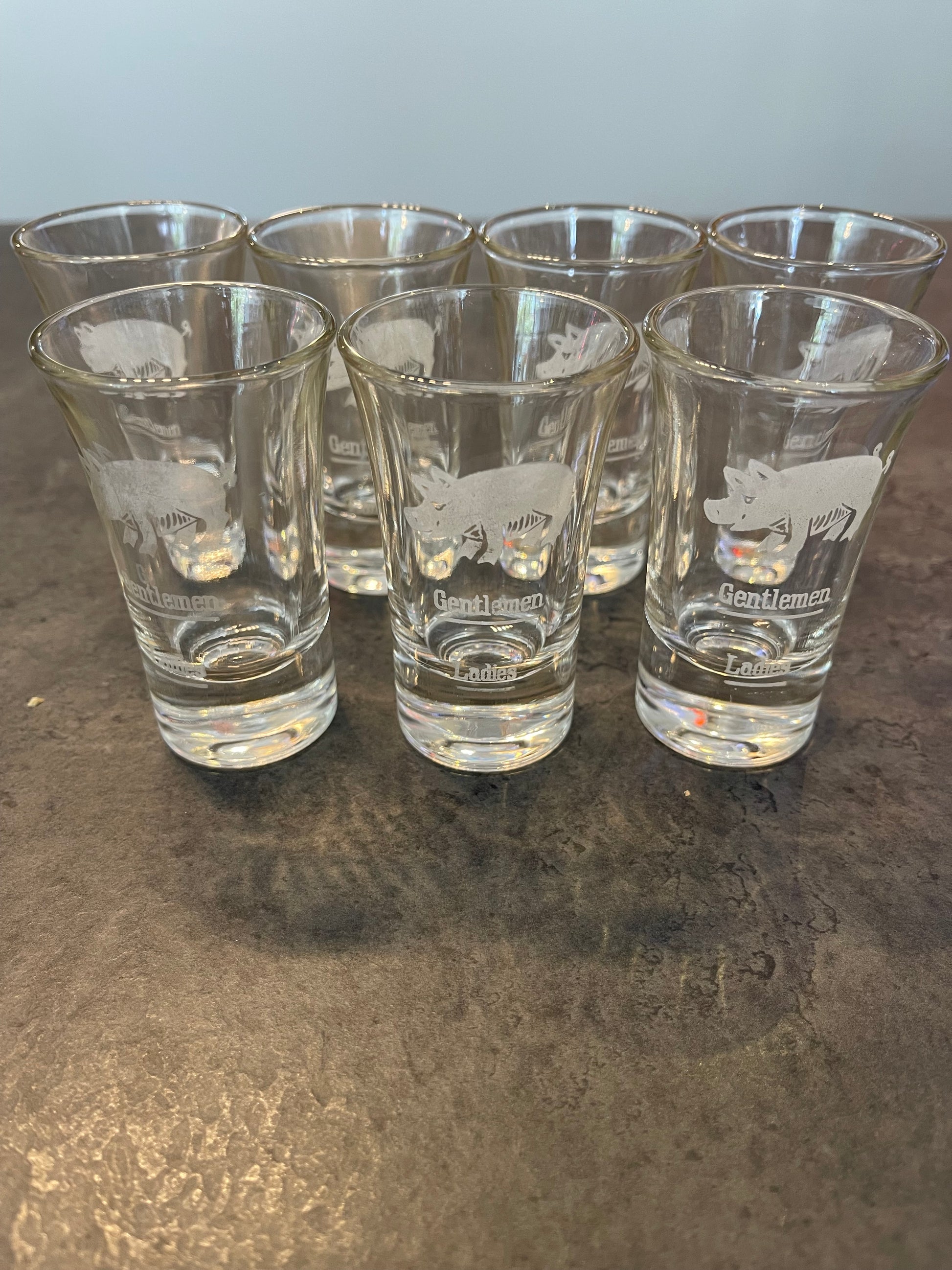 Mid-century shot glasses 3" tall with an etched pig and two lines one for ladies and one for gentleman.