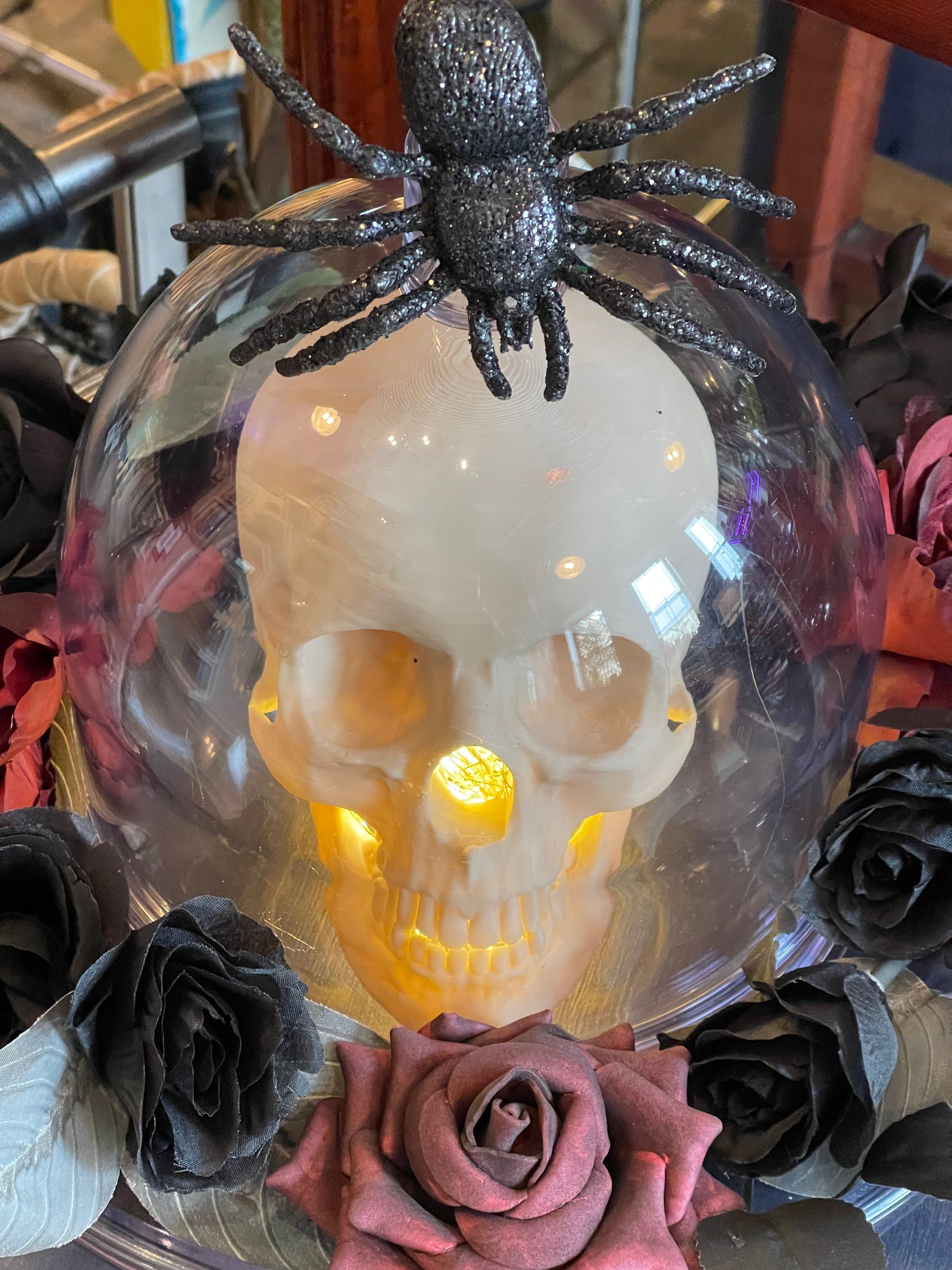 This skull is serving 3d halloween horror. 3d printed illuminated bone skull under a mid century acrylic bell jar platter set adorned with roses.