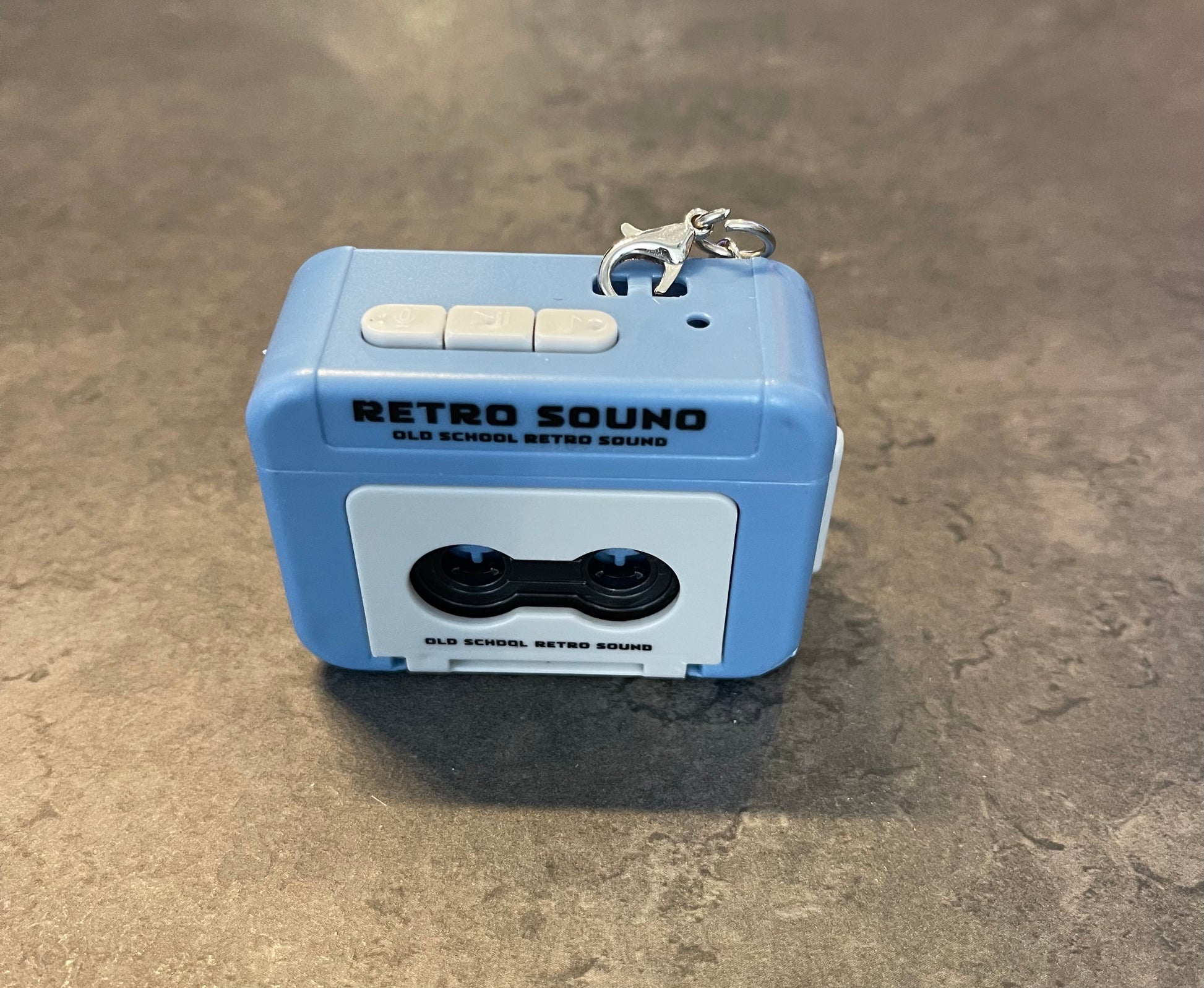 Retro sound spy recorder key chain plays jazzy song or record your own message to play back.