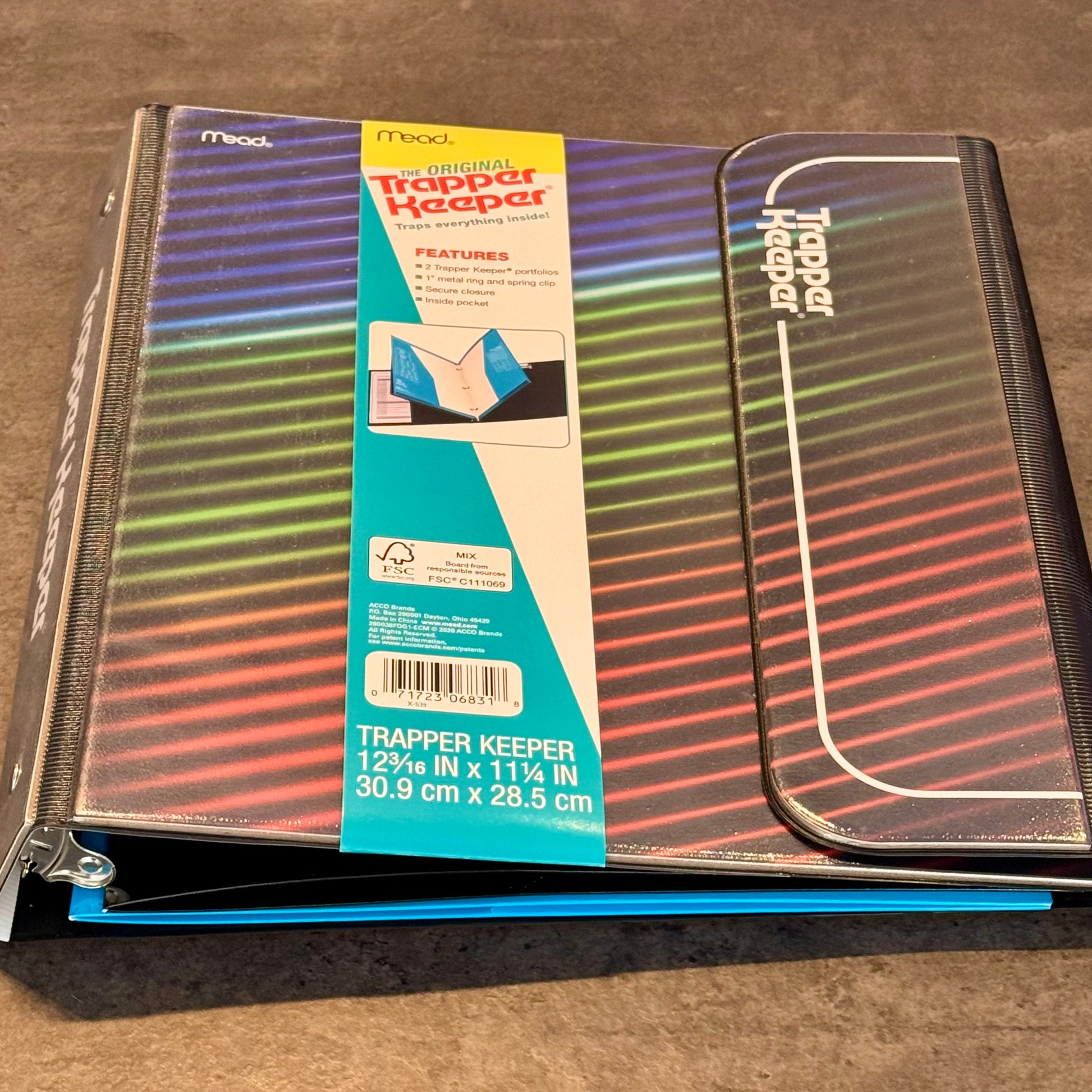 Retro designs produced in 2020 by Mead. Trapper Keeper comes with two colorful folders inside and built in sleeve to hold loose papers. Velcro closure and vinyl covering. Available in 4 designs.