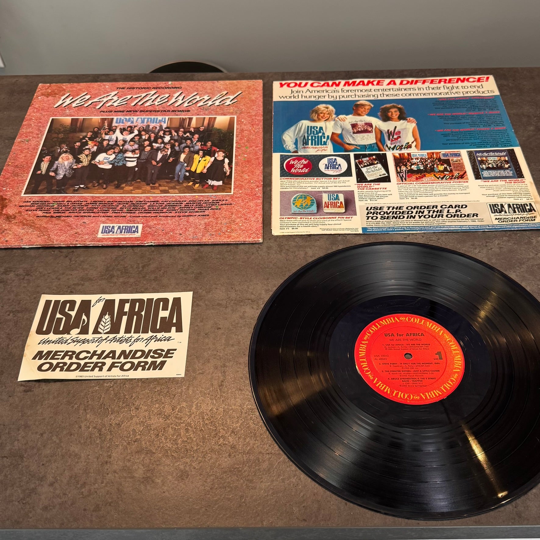 First press USA 40043 - 1985. Record has a few minor scratches on B side but is in great shape overall. Includes sleeve and USA for Africa merchandise order insert. Outer sleeve does have a few water stains on two of the corners. Corners are slightly chipping, see photos.